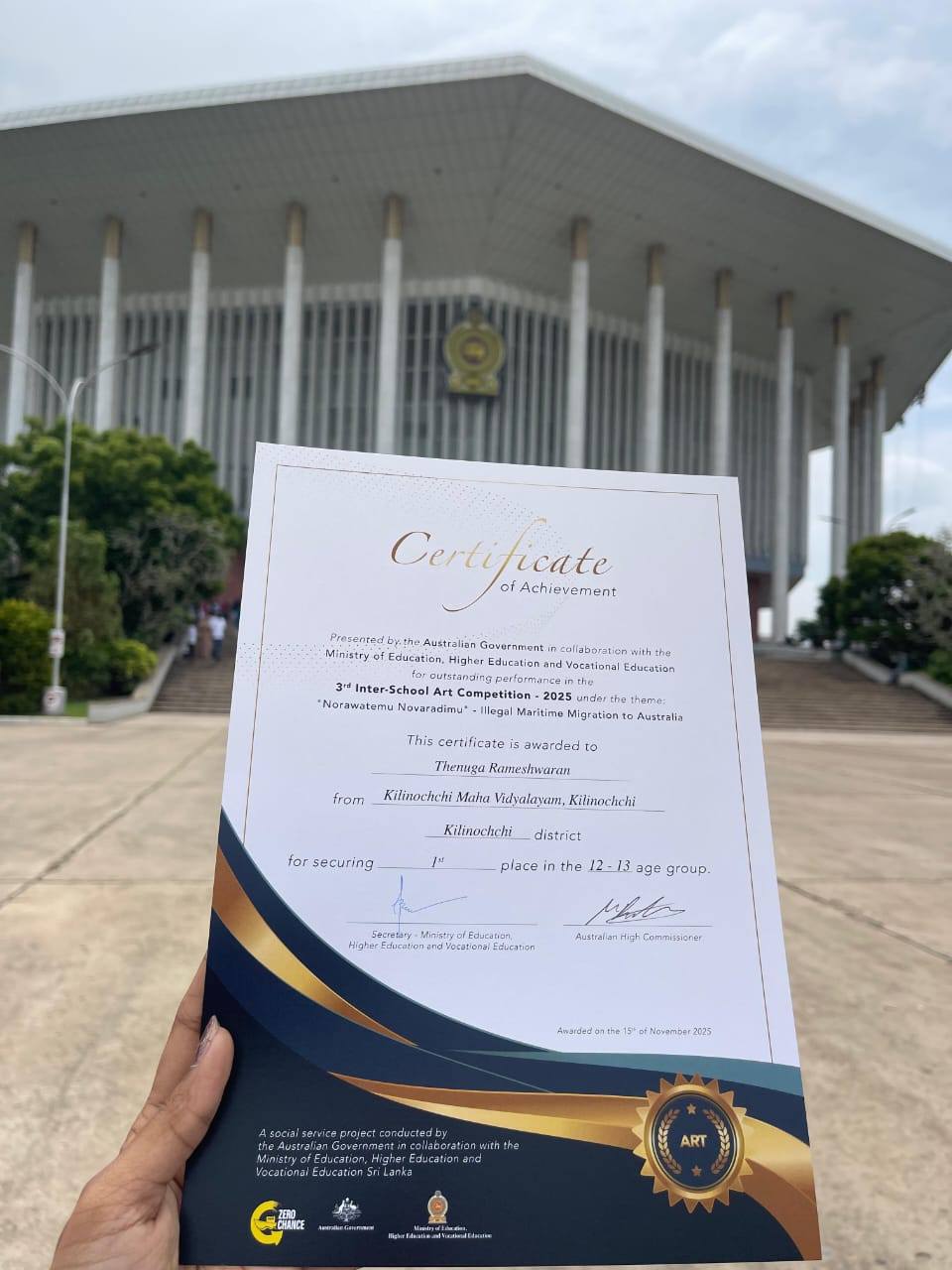 ஆஸ்திரேலியா அரசாங்கத்தினால் நடாத்தப்பட்ட "ஏமாறாதிருப்போம் நேர் வழி செல்வோம்" விழிப்புணர்வு செயற்றிட்டத்தை அடிப்படையாகக் கொண்ட ஓவியப் போட்டியில் பங்குபற்றி எமது பாடசாலை மாணவர்கள் இ.தேனுகா( 12-13 பிரிவில் 1ம் இடம் ), தரம்11 இல் ஶ்ரீ.சாறுகன் ஆகியவர்கள் வெற்றி பெற்று 15.11.2025 அன்று BIMICH இல் சான்றிதழ்களையும் பரிசில்களையும் பெற்றுக் கொண்டனர்